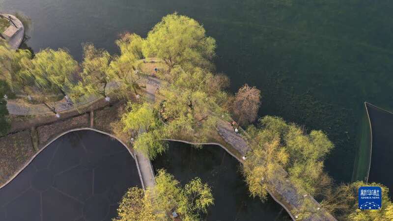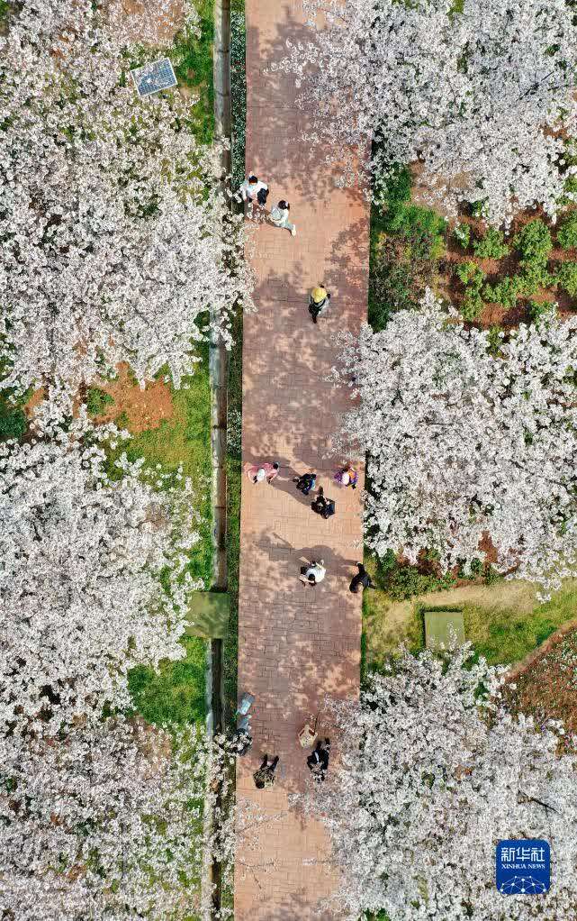 3月10日,市民在江苏南京莫愁湖公园赏春游玩(无人机照片)。
