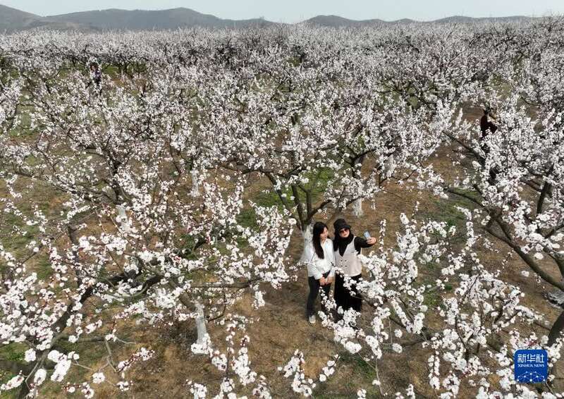3月10日,湖北省襄阳市襄城区尹集乡肖冲村杏花开满枝头,游人在杏花下游玩拍照(无人机照片)。