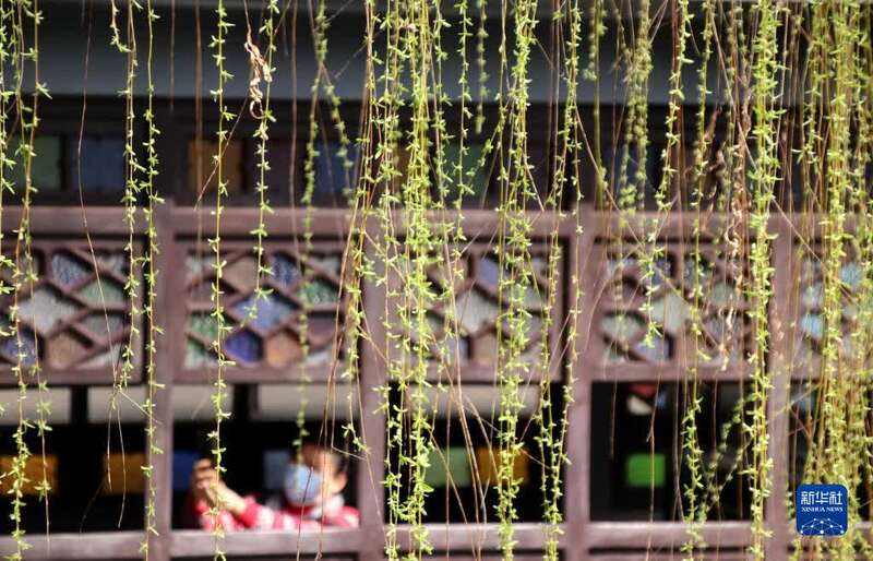 3月10日,游客在江苏苏州古典园林狮子林拍摄吐出嫩芽的垂柳。