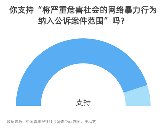 全国两会期间,中国青年报社社会调查中心联合腾讯新闻,对4591名受访者进行的一项调查显示,94%的受访者觉得当下网络暴力事件多。90%的受访者觉得网络暴力会影响青少年价值观形成。90%的受访者支持“将严重危害社会的网络暴力行为纳入公诉案件范围”。