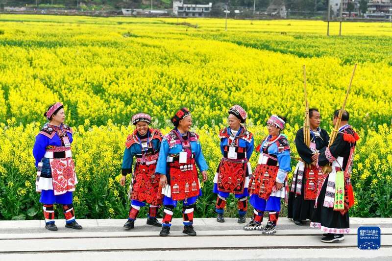 3月11日,在贵州省贵定县盘江镇“金海雪山”景区,身着民族服饰的村民在油菜花田边。