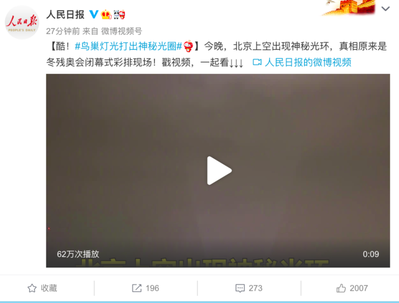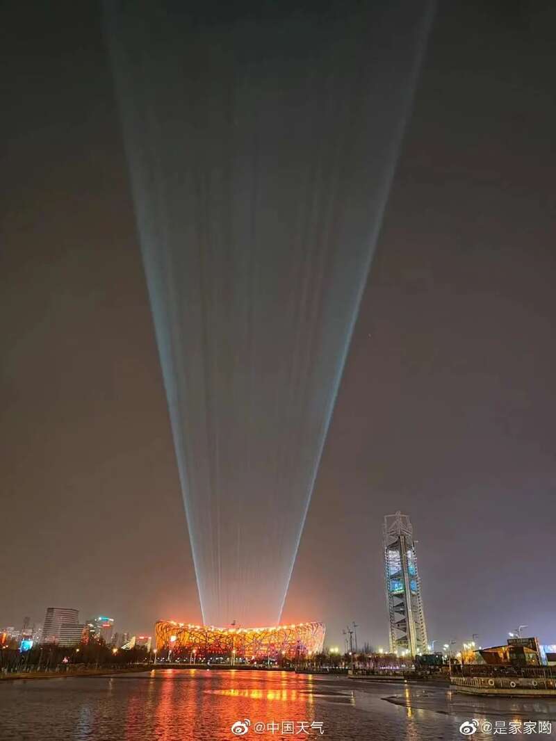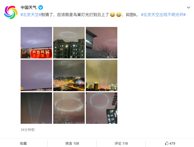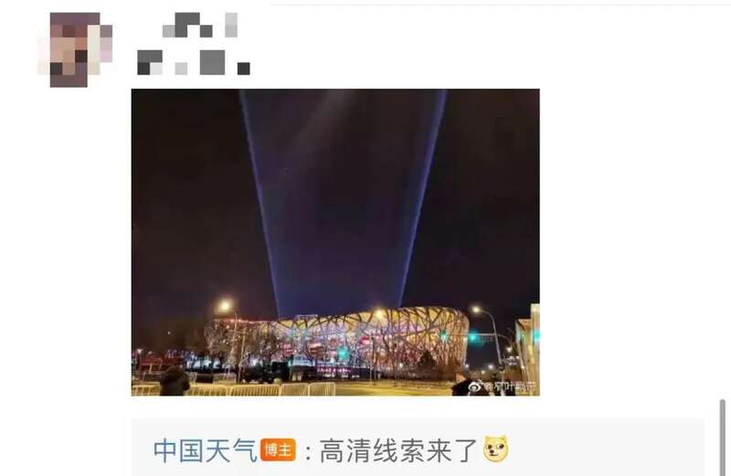 当晚, @中国天气 回复:“别猜了,应该就是鸟巢灯光打到云上了。”还配上了多张鸟巢亮着灯的照片。