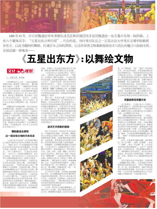 面对如此珍贵的创作题材,主创团队在艺术形式的选择上慎之又慎,力求找到最完美的表达语言。“在我们原来的认知中,舞剧属于小众的剧种。在选材的时候,团队在音乐剧和舞剧中进行了多次探讨后发现,舞蹈确实最适合展现这一国宝级文物的历史风采。”北京演艺集团副总经理、《五星出东方》制作人董宁说,“五星出东方利中国”汉代织锦护臂并没有太多的史料支撑,所以需要更多的艺术想象填补。舞蹈是最原始、最本真、最普泛的人类艺术形式,且舞剧的叙事表现需要通过舞蹈来体现。恰恰是这样一种朴素的形式,可以弥补历史信息稀缺的短板,在舞台上生动地呈现鲜活的考古故事,释放出织锦护臂丰厚的历史文化内涵。