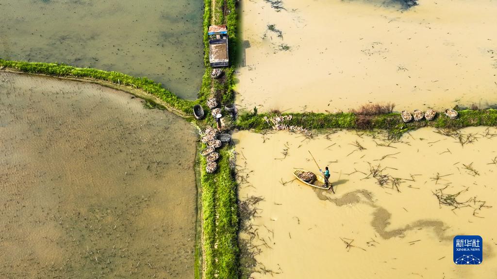 天气回暖,湖南省衡阳市常宁市板桥镇板桥村莲藕种植基地的浅水藕迎来丰收,当地藕农抓紧有利时机采收莲藕,供应市场,田间一派忙碌景象。