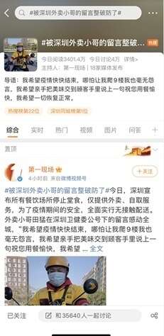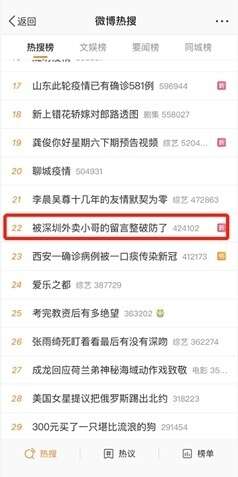 当晚,微博话题#被深圳外卖小哥的留言整破防了#迅速登上了微博热搜,最高登上第20位,同时还登上同城热搜第一,深圳卫健委官方微博也积极进行互动。