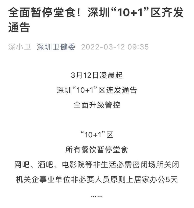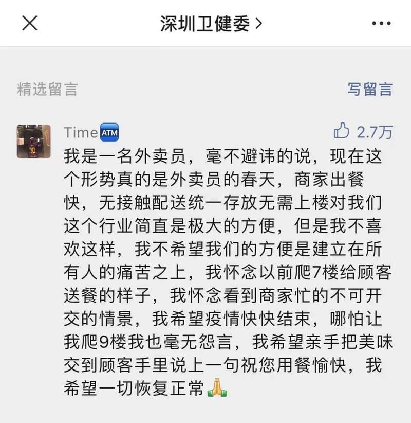 全市社区小区封闭式管理,公交、地铁停运,非基本运转党政机关人员外就地转为志愿者……当前,深圳正经受新一轮严峻疫情的考验,市卫健委官方微信发布的关于“停止堂食”的通告下面,一则外卖小哥的留言,让众多市民共情了,点赞量一下冲破2.7万,还上了微博热搜。