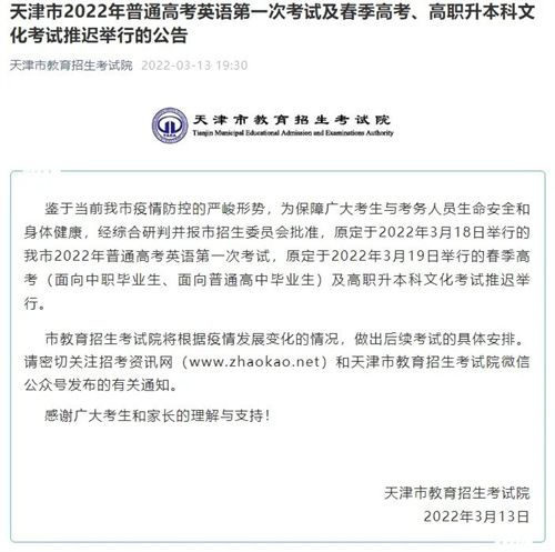 据天津市教育招生考试院消息,13日,天津市发布2022年普通高考英语第一次考试及春季高考、高职升本科文化考试推迟举行的公告,全文如下: