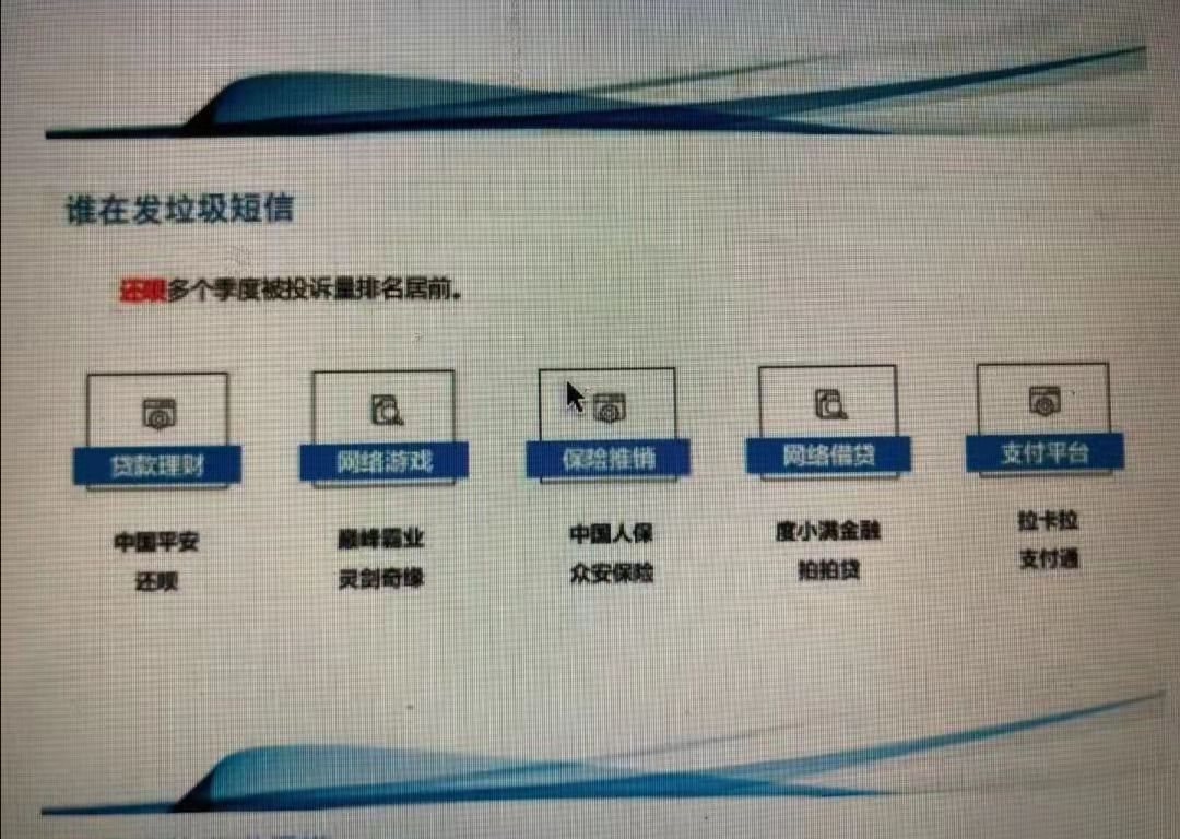 被投诉涉垃圾短信排名居前的,去年一季度,金融理财类有中国平安和还呗、网络借贷类为有钱花和360借条;二季度,贷款理财类有还呗和滴滴金融、网络借贷类有拍拍贷和有钱花;三季度,贷款理财类有中国平安和还呗,网络借贷类有度小满金融和拍拍贷。