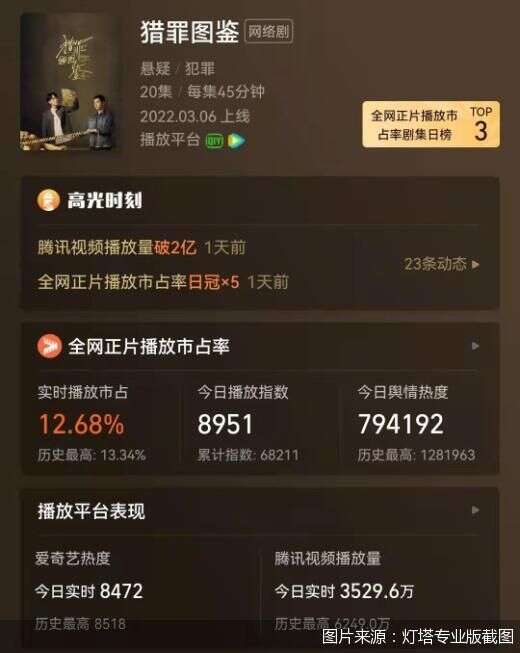 据灯塔专业版显示,截至3月13日,开播8天的《猎罪图鉴》已连续一周均居于灯塔舆情热度榜的首位,且热度值是排在第二位的两倍有余,与此同时,《猎罪图鉴》的全网正片播放市占率也持续排在剧集榜单的前三位,并已有5次坐上日冠的宝座。