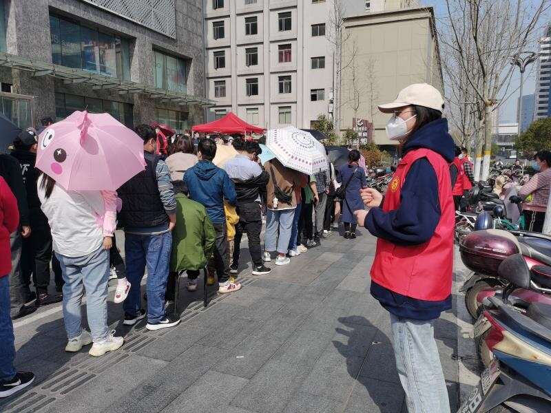 3月14日中午,安徽省合肥市通报,一核酸检测阳性人员于3月12日坐高铁由外地来合肥。当日下午,合肥市蜀山区在相关场所开展区域核酸检测,70671份样本检测结果均阴性。3月15日一大早,大量和确诊患者“时空伴随”的居民来到蜀山区做核酸检测,上午10点,团蜀山区委接到社区人手紧缺的消息,中午11点40,从800名报名者中招募选派40名青年志愿者下沉社区,助力核酸检测点的秩序维护。