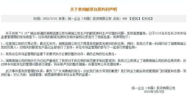 湖南插旗菜业有限公司官网显示,公司与肯德基、麦当劳等一大批知名企业建立了产品代加工和原料直供等方面的战略合作关系。目前,该公司官网显示“您的网站正在暂停中,解除暂停即可正常访问!”连夜改声明,统一酸菜到底是哪的?3月15日晚,统一企业中国控股有限公司(下称统一)官网出现了“发声明、删声明、再发声明”的情况,值得注意的是,这两次声明内容相差巨大。2022年央视“3·15”晚会曝光后不久,统一便发表声明称,最近五年内湖南插旗公司已不再是公司酸菜包原料的供应商;已立即停止了湖南锦瑞公司的供应商资质。