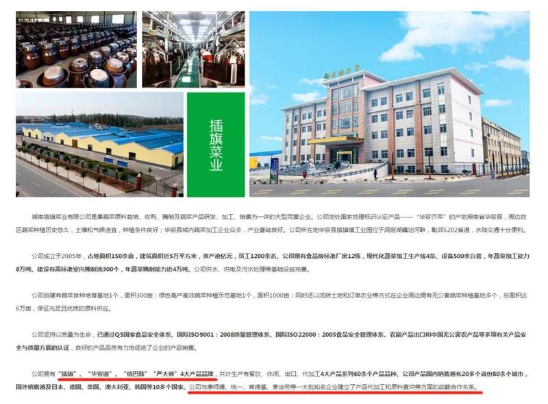 2022年央视3.15谈及食品安全违法违规行为,点名“湖南插旗菜业有限公司”。插旗菜业是湖南省华容县较大的蔬菜再加工企业,为多家知名企业代加工酸菜制品,也为一些方便面企业代加工老坛酸菜包,号称老坛工艺,足时发酵。然而从实地探访可以看到,该企业标准化腌制池腌出来的酸菜是用来加工出口产品的,老坛酸菜包里的酸菜则是从外面收购来的“土坑酸菜”。 插旗菜业官网显示,公司与统一、肯德基、麦当劳等一大批知名企业建立了产品代加工和原料直供等方面的战略合作关系。