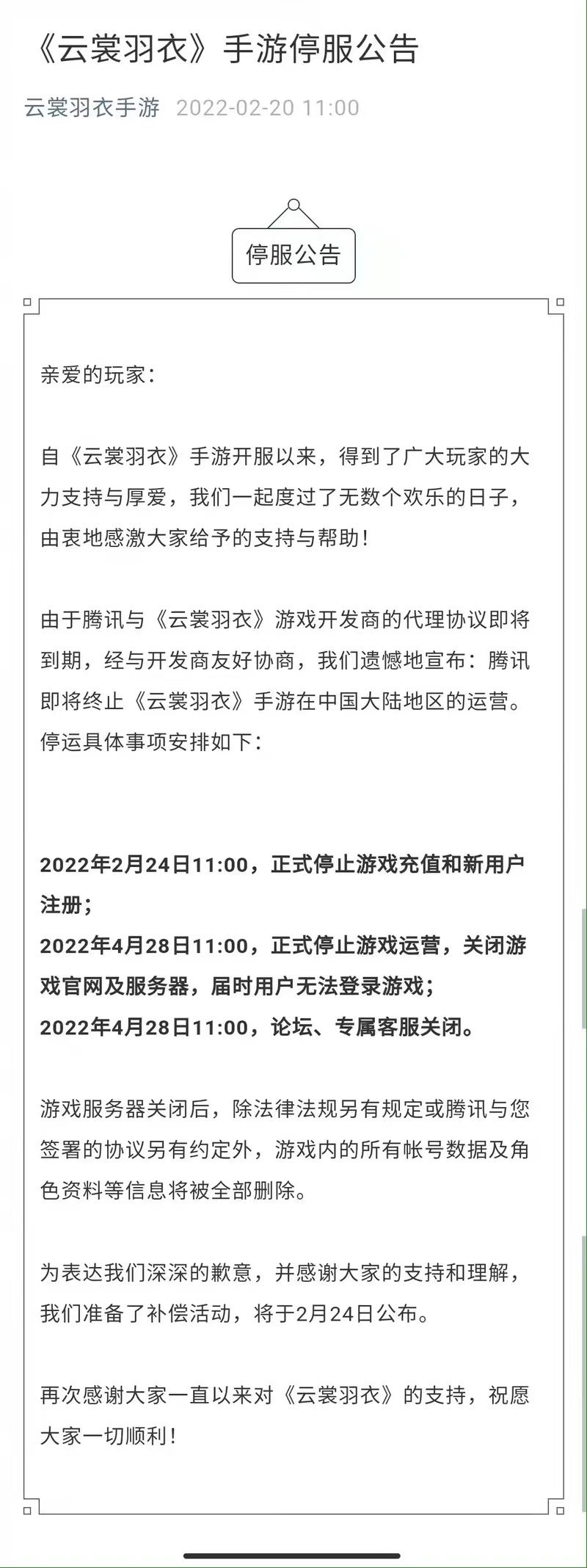 今年2月20日,由深圳市腾讯计算机系统有限公司和成都西山居世游科技有限公司联合研发的手机游戏《云裳羽衣》在官方微博宣布将停止运营,并给出了具体时间表:2月24日11点停止游戏充值和新用户注册;4月28日11点停止游戏运营,用户将无法再登录,同时论坛、专属客服关闭。而游戏服务器关闭后,“除法律法规另有规定或腾讯与您签署的协议另有约定外,游戏内的所有账号数据及角色资料等信息将被全部删除。”