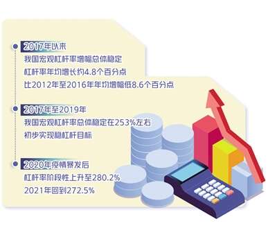 宏观杠杆率是一国总债务与国内生产总值(GDP)之比。2017年以来,我国宏观杠杆率增幅总体稳定,杠杆率年均增长约4.8个百分点,比2012年至2016年年均增幅低8.6个百分点。2017年至2019年我国宏观杠杆率总体稳定在253%左右,初步实现稳杠杆目标。2020年疫情暴发后,杠杆率阶段性上升至280.2%,2021年回到272.5%。