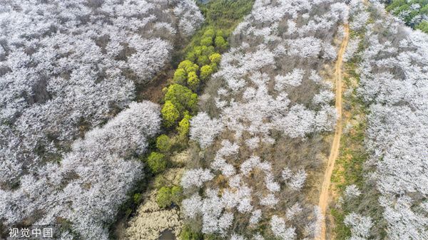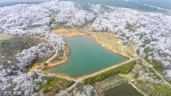 2022年3月16日,安徽宣城,航拍郎溪县新和旅游度假区千亩樱花林。