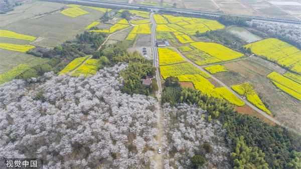 近日,气温快速回升,郎溪县新和旅游度假区千亩樱花林也提前进入了盛花期。从无人机镜头俯瞰,千亩樱花与周边的绿树、花田相互辉映,春光无限,美不胜收。