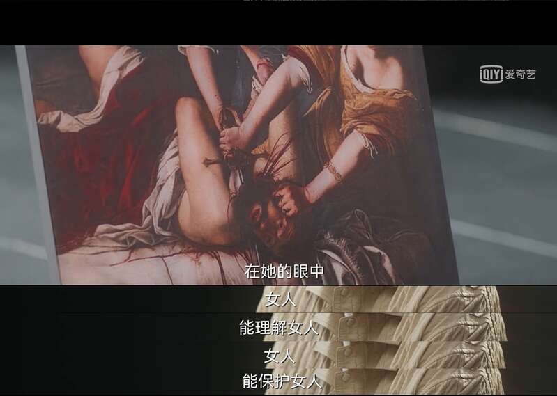 例如家暴案中,案件尾声处,镜头将前妻和现女友分别坐在审讯室里的画面呈现在同一镜头中以形成“镜像”,凸显着看似应该“对立”的两位女性,联合起来反抗暴力、企图自救的悲剧色彩。更直白的是男主借点评《朱迪斯斩杀赫罗弗尼斯》这一题材的三幅绘画作品,指出只有女性画家阿尔泰米西娅·真蒂莱斯基的作品中,被男性当作“旁观者”的女仆也参与到谋杀之中,念出了那一句“女人,能够理解女人;女人,能够帮助女人。”