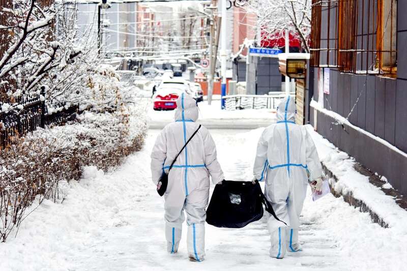 3月16日,长春市朝阳区永昌街道社区工作人员挨门挨户发送“新冠病毒抗原自检测试剂盒”。新华社记者 周长庆 摄