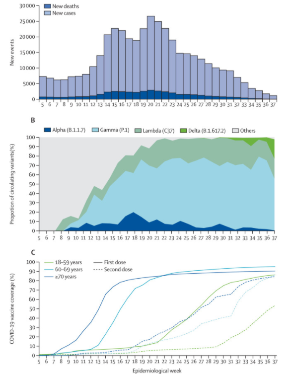 阿根廷主要流行的变异株是伽马(p.1)、拉姆达(C.1)、阿尔法(B.1.1.7)。该研究在2021年1月到9月(流行病学第5周到37周)间执行。该研究对疫苗的效果进行了回顾性研究,旨在评估在60岁及以上的老年人中,疫苗对减少感染新冠风险的有效率及对减少因新冠死亡的有效率。