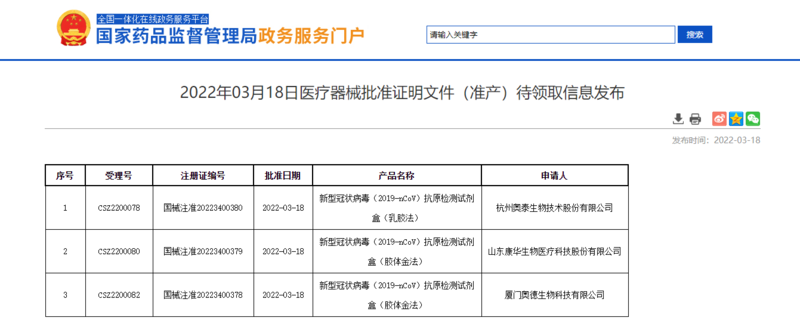 3月18日晚上,国家药监局审批通过了三家企业的新冠抗原自测产品的注册申请。自此国内已经获批的新冠抗原自测产品已经达到17款。