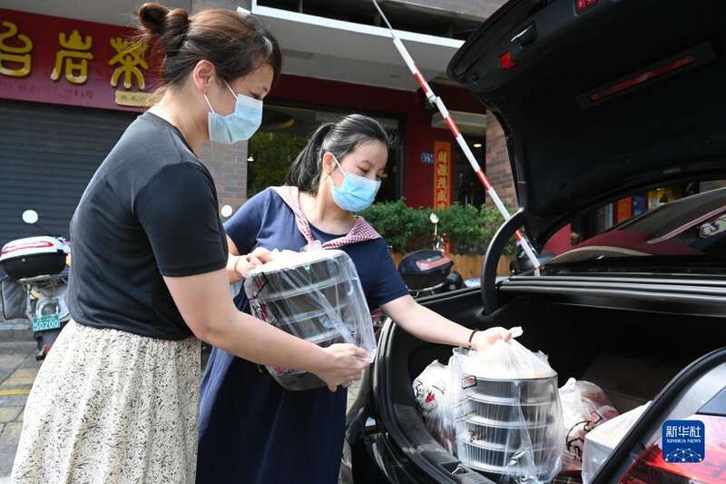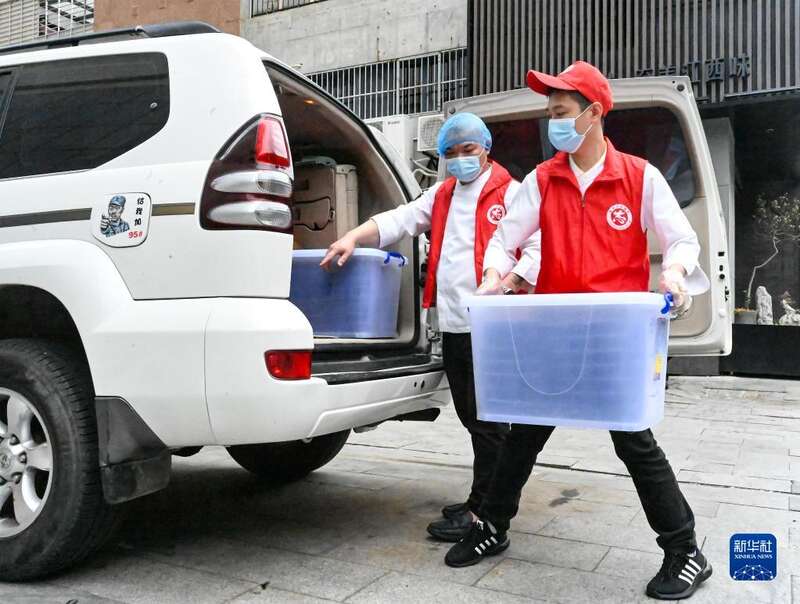 3月18日,在泉州市丰泽区,餐饮店的商家在运送爱心午餐。