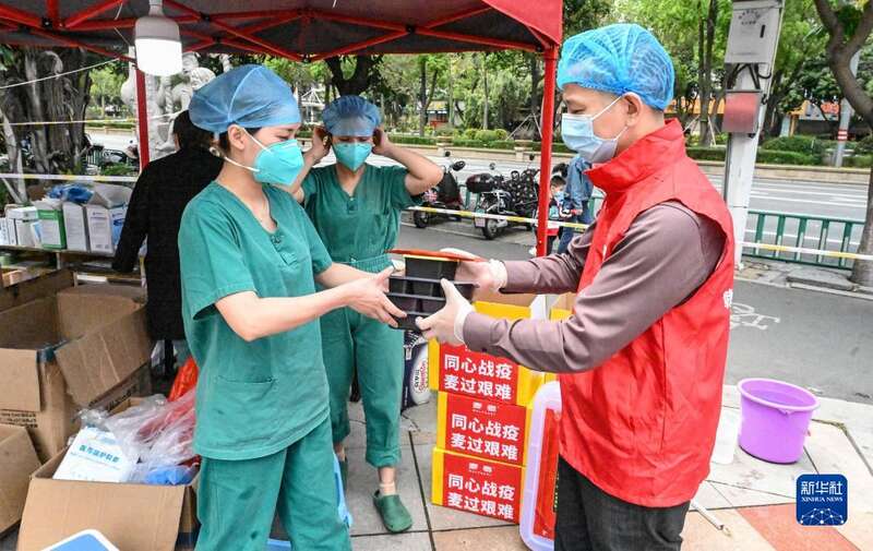 3月18日,在泉州市丰泽区一处核酸检测点,医务人员从餐饮店志愿者手中接过爱心午餐。