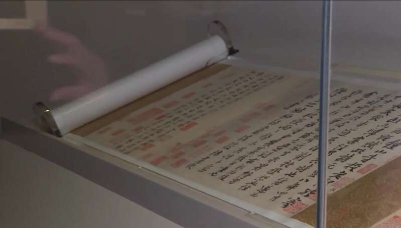 展览上另一件重要文物是北宋政治家、文学家王安石的传世真迹《行书楞严经旨要卷》。尽管这件作品书写于王安石去世前一年,但在杨志刚看来“笔力依然雄浑有力”。“这件文物除了王安石的字难得,后面的跋同样难得。”据介绍,作品后面的题跋包括南宋牟献之、元代的王蒙等。“我们还没有完全打开。”杨志刚告诉网友们,未来上海博物馆东馆具备足够的空间条件后,会想办法将这样的长卷完全打开,全面展示在参观者面前。