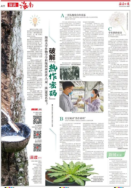作为我国唯一以橡胶等热带作物为主要研究对象的重要学科,海南大学热带作物学院作物学学科已经走过了一个甲子。日前,该学科再次进入“双一流”建设名单。