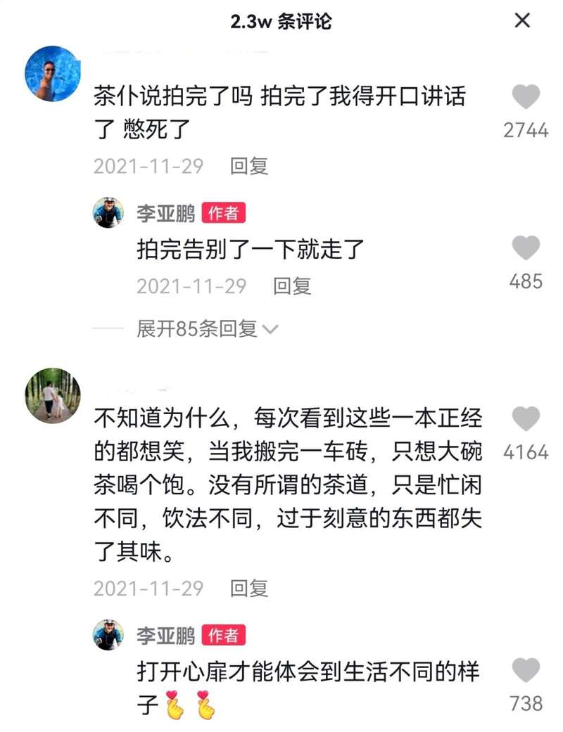 在视频中,茶仆一身粗布长衫,目不斜视,席地而坐,看起来颇为神秘。“感知到”李亚鹏进来,茶仆伸手示意,邀请其就座,李亚鹏则鞠躬应对。整个泡茶、饮茶过程中,两人当真不发一言,只有注水声和饮茶声。从视频字幕中可见,李亚鹏想传达一种全身心品茶的意境,但网友却不由得替他们憋得慌,“尴尬到用脚趾抠出三室一厅”“处处透露着刻意”。