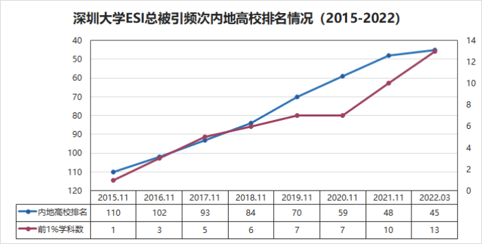 2022年,深圳大学学科建设持续发力。根据科睿唯安(Clarivate Analytics)2022年3月10日最新的ESI(Essential Science Indicators,基本科学指标)数据显示,深圳大学新增”神经科学与行为学”学科进入ESI全球排名前1%行列,我校ESI全球前1%的学科数上升至13个。