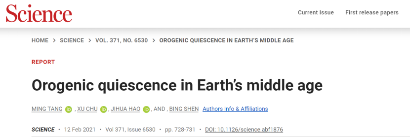 近乎“闭关”的生活为唐铭开启了一扇通往遥远过去的时空之门。在日复一日的沉寂中,“地球中年的造山沉寂”诞生了。2021年2月12日,研究文章 Orogenic quiescence in Earth’s middle age发表在《科学》(Science)上。