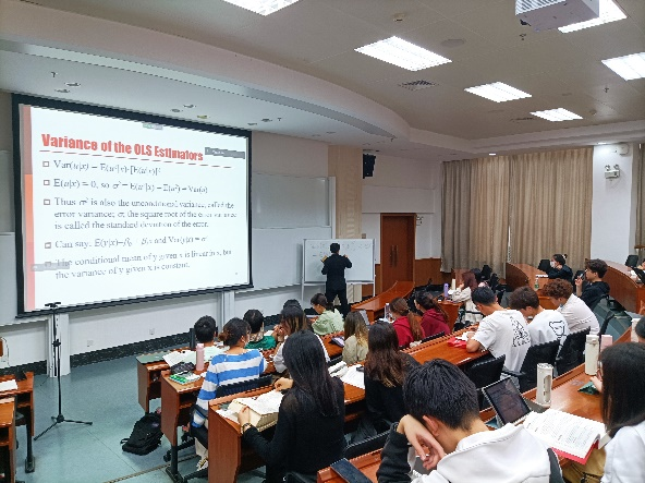 岭南学院副教授李兵给2020级国际商务专业本科生线上线下同步讲授《计量经济学》,未返校国际留学生在家上网课