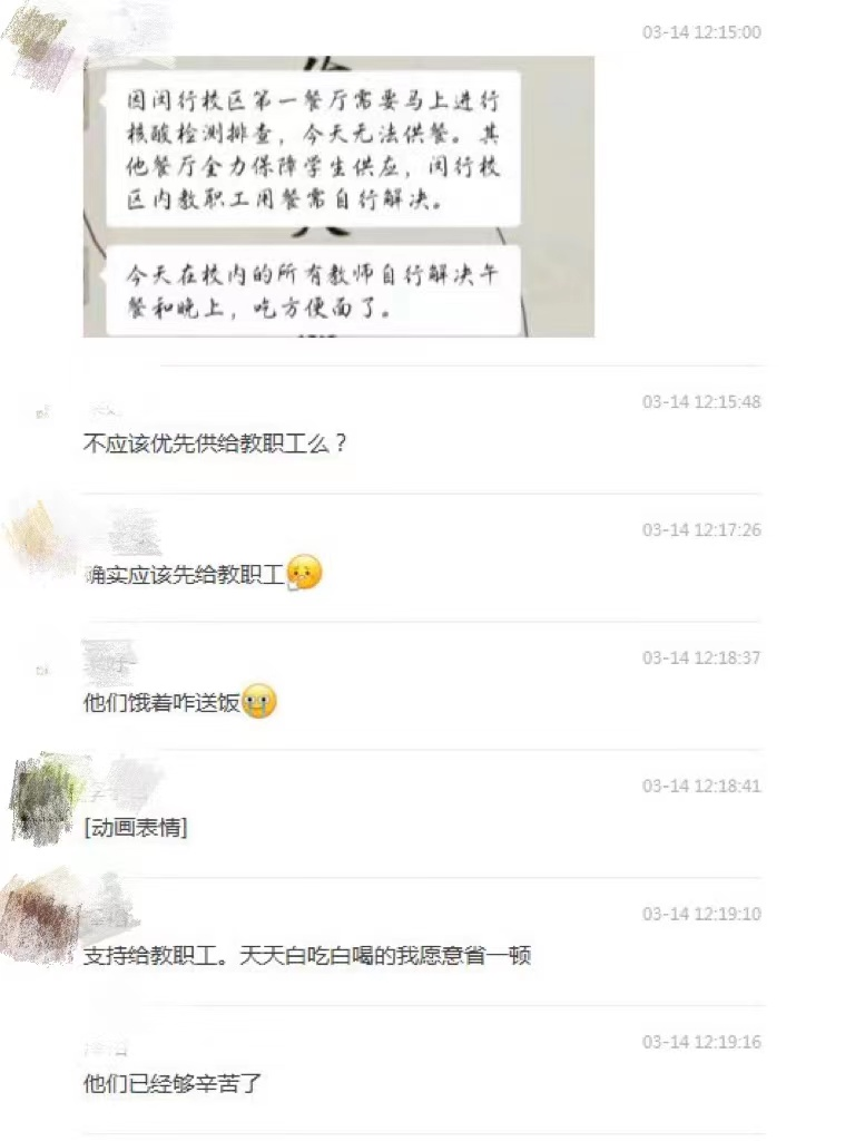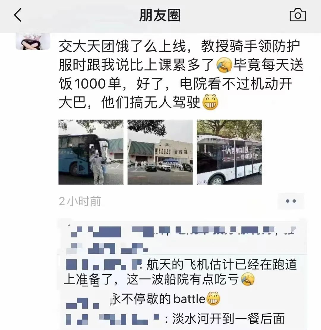 “看留校老师的朋友圈,老师们连续几天晚上都只睡了几个小时,甚至几天几夜不合眼。白天还作为志愿者帮助后勤给封楼的同学送餐。相信有这样的老师们,交大一定能挺住!交大加油!”