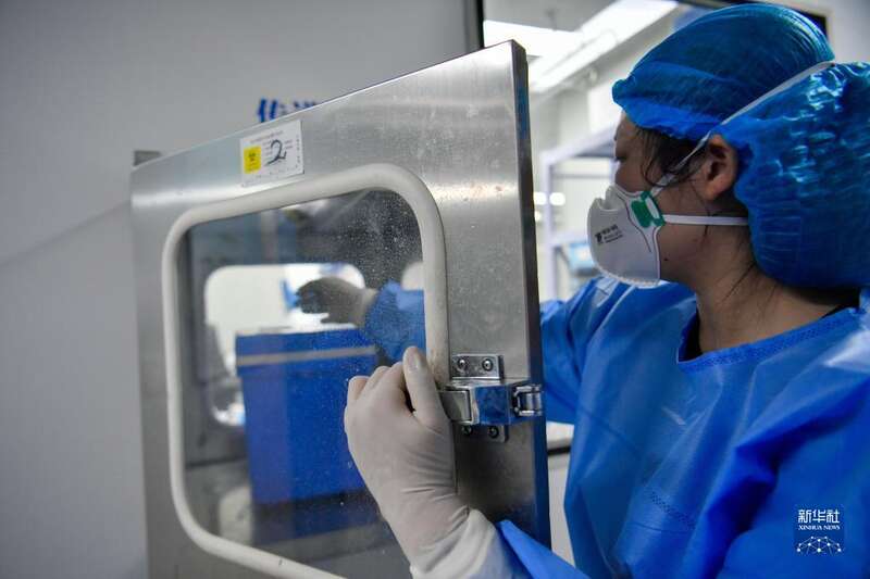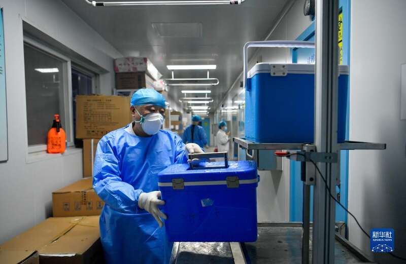 3月19日,在天津市河北区城市核酸检测基地内,工作人员将样本箱放入传递窗口。