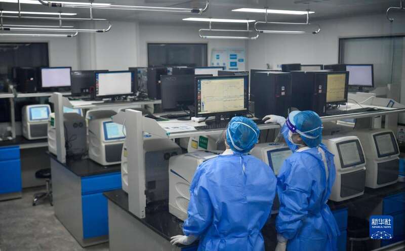 3月19日,在天津市河北区城市核酸检测基地内,工作人员在扩增分析区分析核酸样本数据。