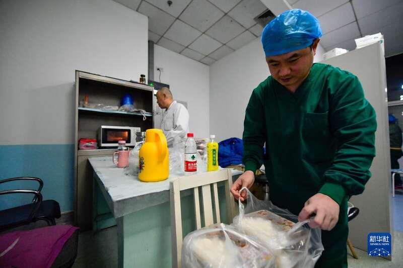 3月19日晚,在天津市第一医院休息室,换班的工作人员在加热晚餐。