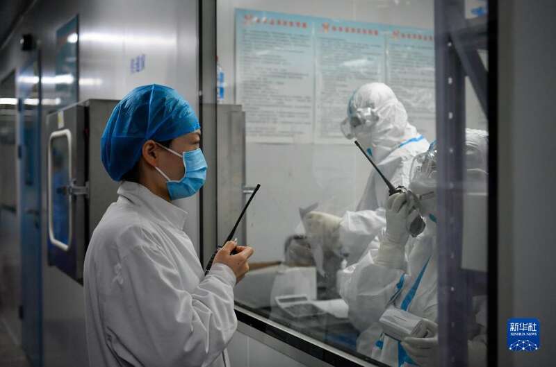 3月19日,在天津市河北区城市核酸检测基地内,PCR检测室组长马晋(左)通过对讲机与实验室内的工作人员沟通。
