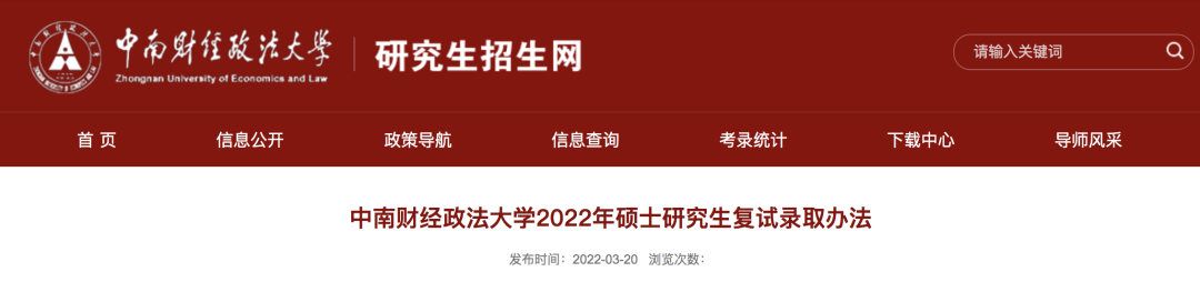 3月20日,中南财经政法大学发布《2022年硕士研究生复试录取办法》,按照防疫要求,采用网络远程方式开展复试。复试工作安排在2022年3月26日—30日期间进行。