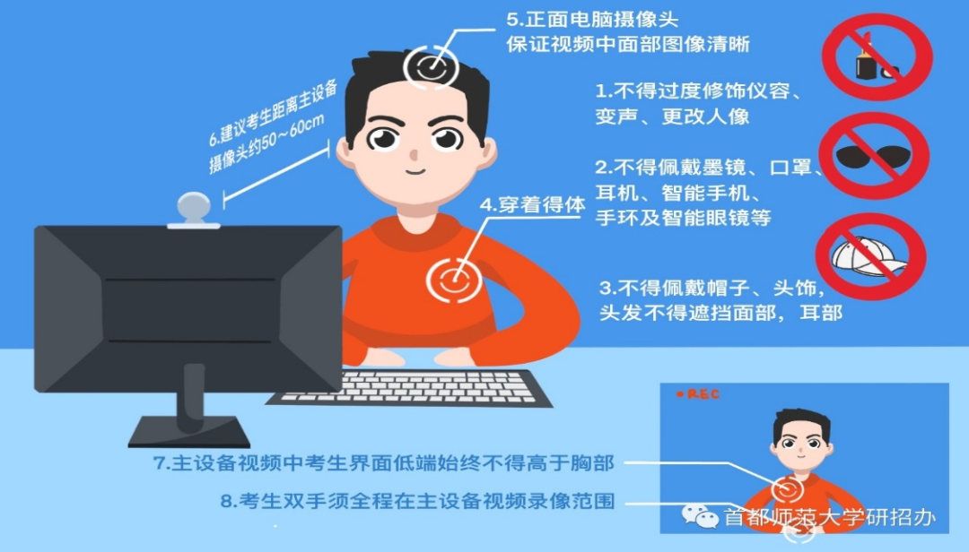 首都师范大学要求,考生复试时正向面对第一机位,保证头肩部及双手出现在视频画面中,保证面部清晰可见,头发不得遮挡面部、耳部,不得佩戴帽子、耳饰、口罩、耳机、智能手表、手环及智能眼镜等。