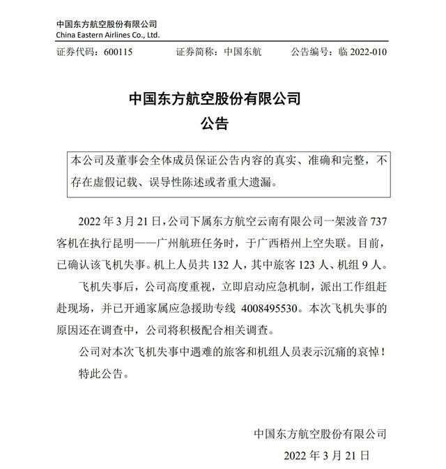 中国东航公告,3月21日,公司下属东方航空云南有限公司一架波音737客机在执行昆明——广州航班任务时,于广西梧州上空失联。目前,已确认该飞机失事。机上人员共132人,其中旅客123人、机组9人。飞机失事后,公司高度重视,立即启动应急机制,派出工作组赶赴现场,并已开通家属应急援助专线4008495530。本次飞机失事的原因还在调查中,公司将积极配合相关调查。公司对本次飞机失事中遇难的旅客和机组人员表示沉痛的哀悼!