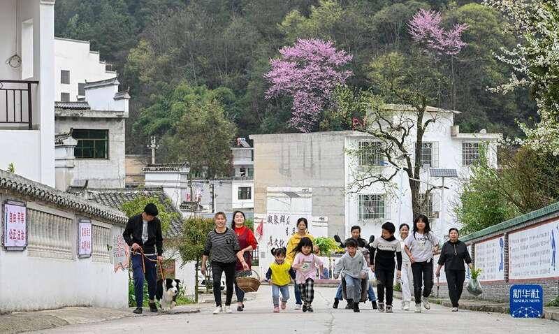 3月20日,贵州省龙里县谷脚镇观音村村民走在村中道路上。