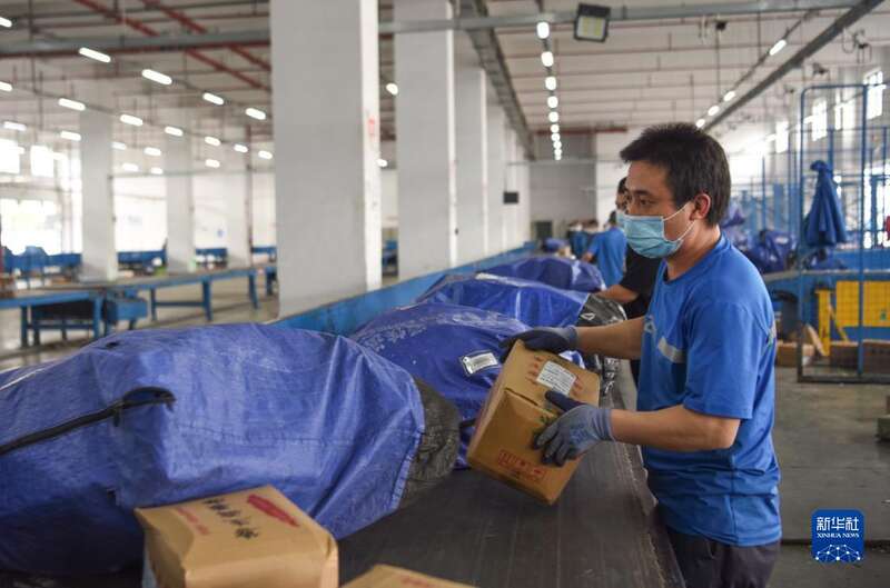 3月20日,在贵州省龙里县谷脚镇快递物流园的一家快递公司,员工在分拣快件。