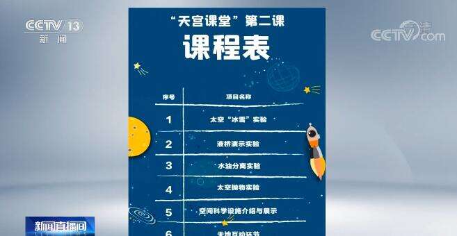 这次授课活动讲什么?来看一下课程表:届时,航天员将在轨演示太空“冰雪”实验、液桥演示实验、水油分离实验、太空抛物实验,介绍与展示空间科学设施,另外还有天地互动环节,航天员真诚邀请社会各界特别是广大青少年在地面同步尝试开展相关实验。