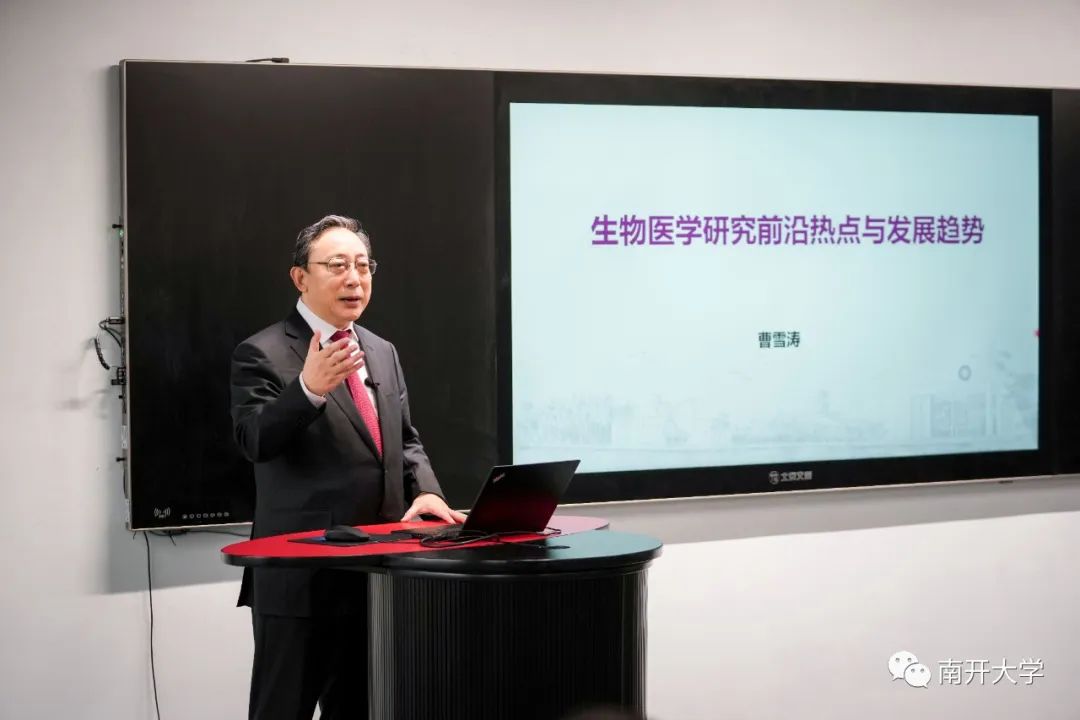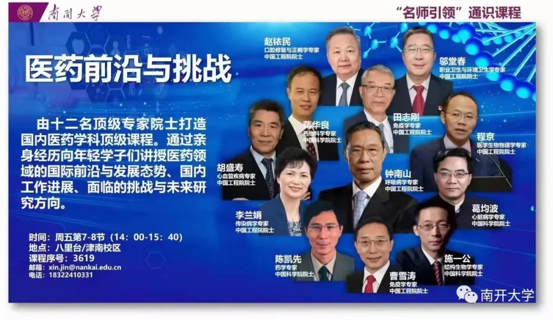 着眼全球生物医药前沿趋势,医学院于本学期正式开设由12位院士主讲的《医药前沿与挑战》通识选修课,该课程由曹雪涛负责,面向南开大学和天津医科大学本科生开放,目标是打造国内医药学科顶级课程。