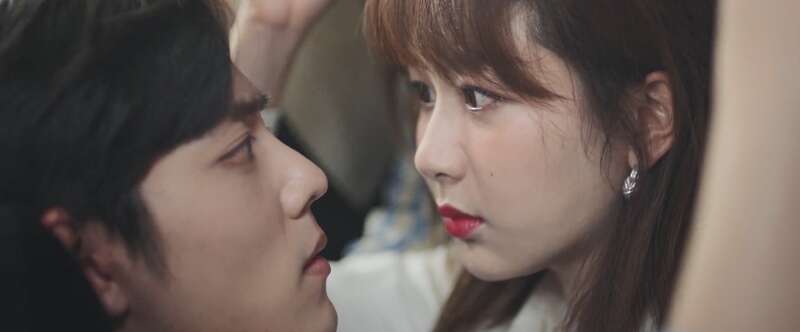 拉扯之间,两人一同倒向了沙发,就有了一次亲密接触。这其实就是偶像剧里摔倒拥抱,或者摔倒吻上去的翻版。
