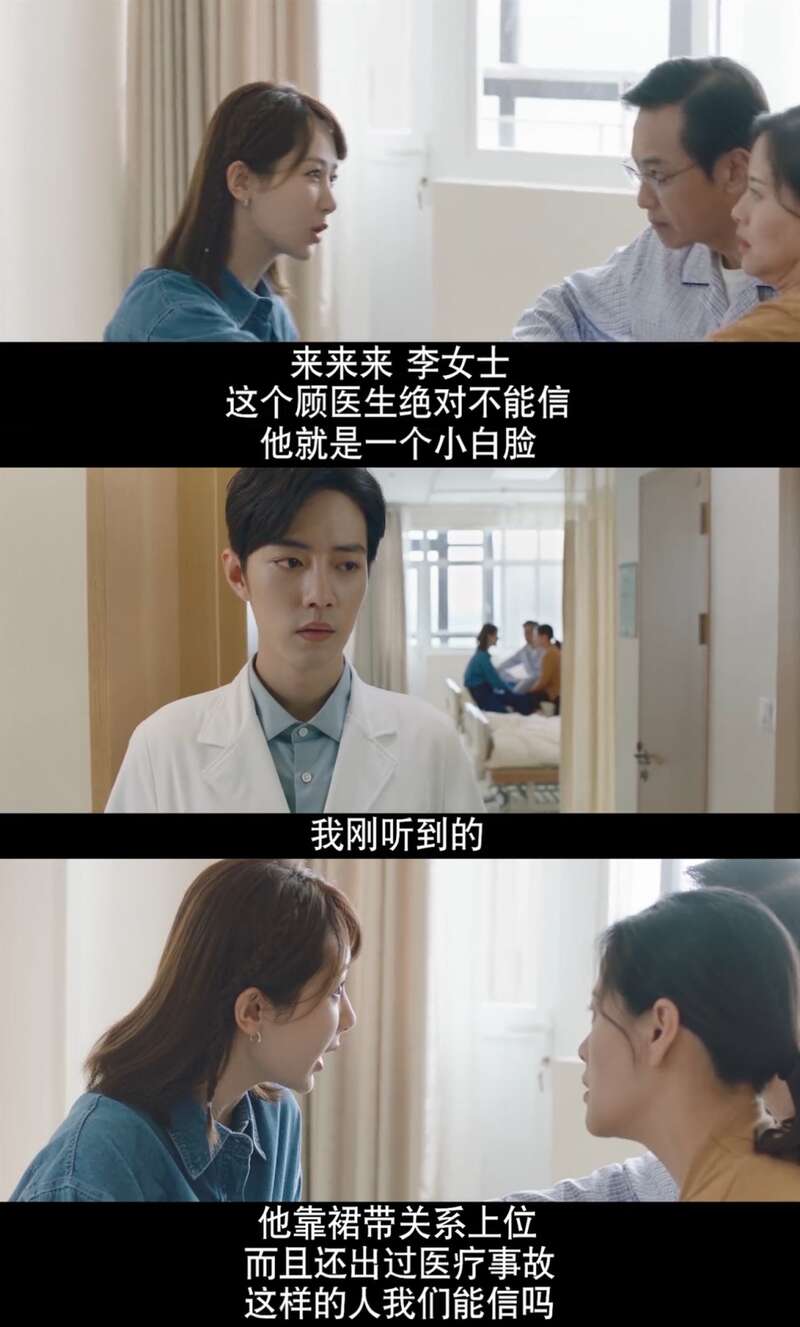 还没完。林父住院了,父女俩发现顾魏是医院里的医生,一脸的不信任。林之校又偶然听到了一些关于顾魏的风言风语,就在病房里大喇喇地(有其他病人家属在)告诉父母不要信任顾魏:“他就是一个小白脸,我刚听到的,他靠裙带关系上位,而且还出过医疗事故,这样的人我们能信吗?”