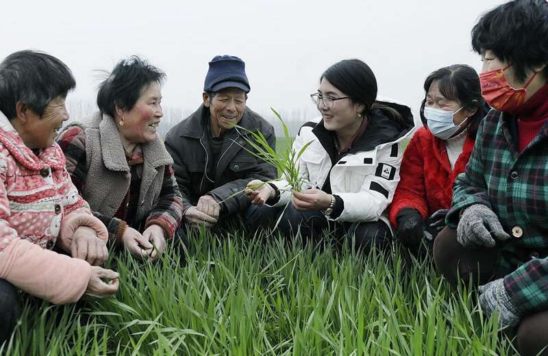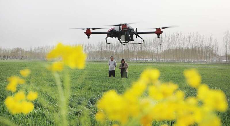 3月19日上午,在河南省开封市尉氏县邢庄乡拐杨村脱贫户李海梅的麦田边,邢庄乡的农技人员正对因近期“倒春寒”天气对小麦田间管理做技术指导。农技人员在悉心的指导,村民们在专心的听讲。麦田的另一旁,农机人员在给植保无人机安装电池、倒入叶面喷施药肥、轻按操作手柄,无人植保机便原地升空,向着麦田飞去…