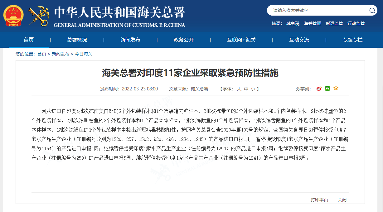 据海关总署网站消息,因从进口自印度4批次冻南美白虾的3个外包装样本和1个集装箱内壁样本,2批次冻带鱼的3个外包装样本和1个内包装样本,2批次冻墨鱼的3个外包装样本,2批次冻叫姑鱼的2个外包装样本和1个产品本体样本,1批次冻鱿鱼的1个外包装样本,1批次冻舌鳎鱼的1个外包装样本和1个产品本体样本,1批次冻鳗鱼的1个外包装样本中检出新冠病毒核酸阳性。