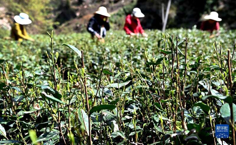 3月23日,茶农在镇安县达仁镇象园村的山坡上采摘明前茶。