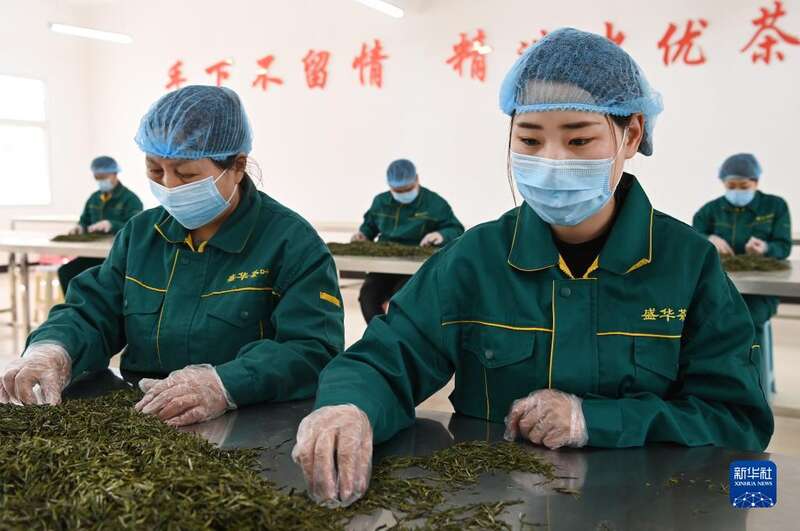 3月23日,镇安县一家茶叶公司的员工在车间挑选新茶。